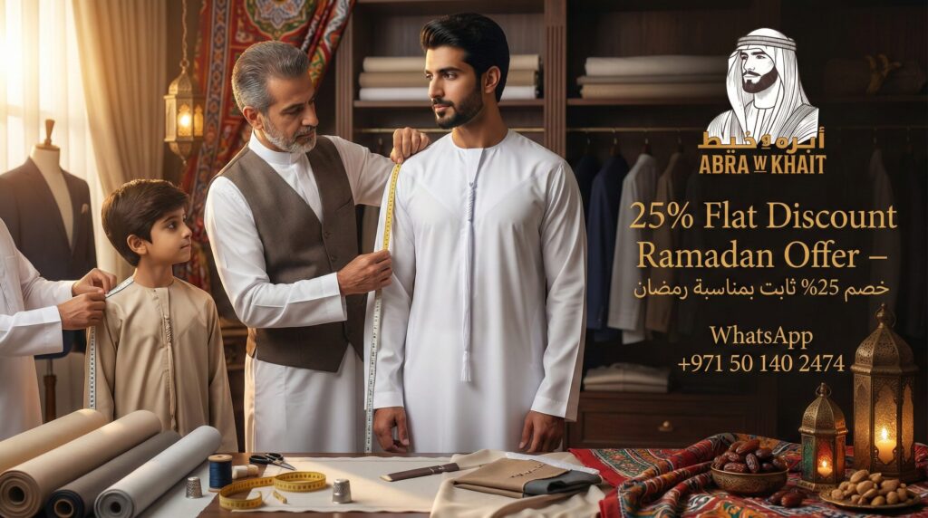 Celebrate the holy month of Ramadan with ABRA W KHAIT and enjoy an exclusive 25% flat discount on premium men and boys tailoring services. Ramadan is a time of elegance, tradition, and togetherness, and your attire should reflect the same. At ABRA W KHAIT, we specialize exclusively in men and boys tailoring, offering perfectly stitched Arabic Kandura, Pakistani Shalwar Kameez, and Indian Kurta Pajama using high-quality fabrics and expert craftsmanship.