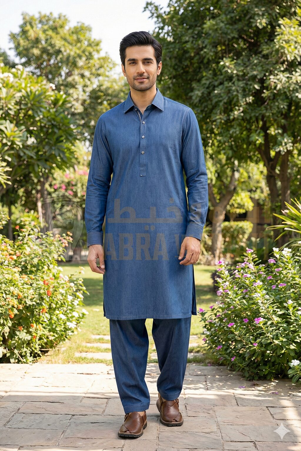 Embrace effortless style with this Classic Denim Blue Men’s Pakistani Shalwar Kameez. Tailored in a soft, denim-effect fabric, this two-piece set pairs a straight-cut kurta with a neat shirt collar and partial button placket, plus a relaxed shalwar for all-day comfort. The versatile denim blue shade makes it perfect for casual outings, family gatherings, or low-key celebrations — easy to dress up with leather Peshawari sandals or keep simple with loafers.