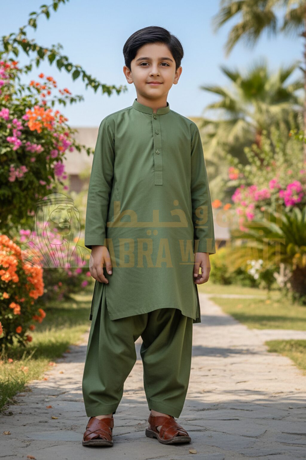 Elegant Pakistani shalwar kameez for boys in a unique Olive Green shade